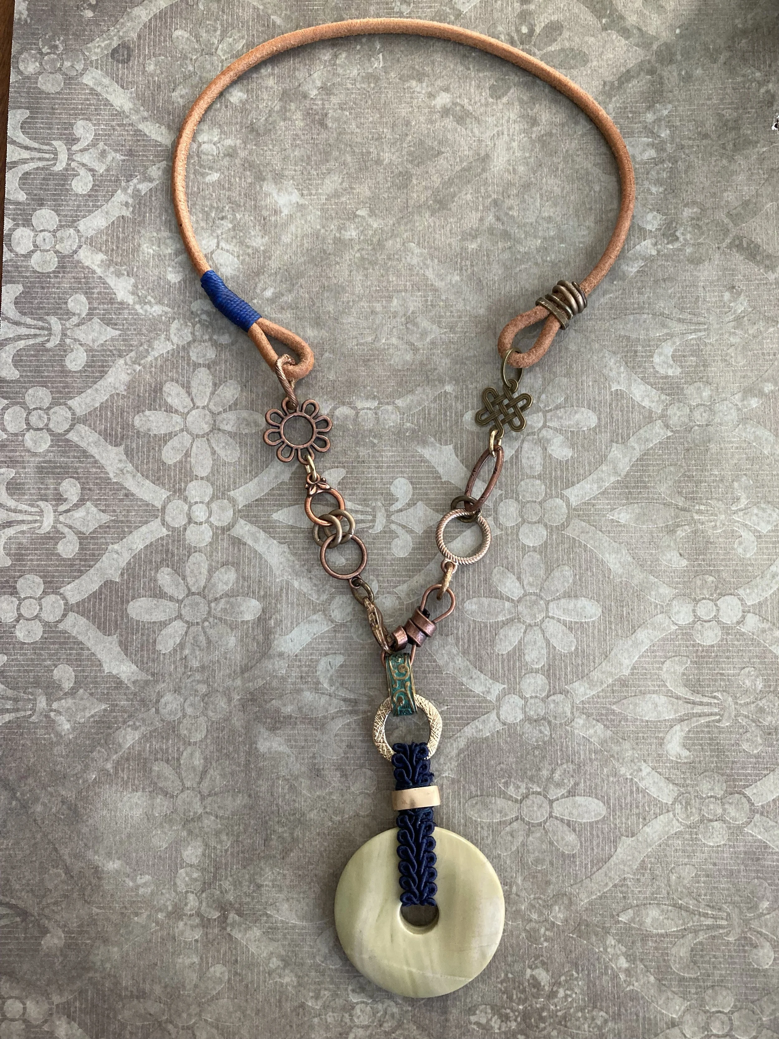 Shop › Green Onyx Necklace Green Onyx Necklace $65.00 Made with green onyx, copper, brass, patina brass, steel, leather & trim. Length: 17.5 inchesSKU N701 Made with green onyx, copper, brass, patina brass, steel, leather & trim. Length: 17.5 inchesSKU N701 Add To Cart Added!